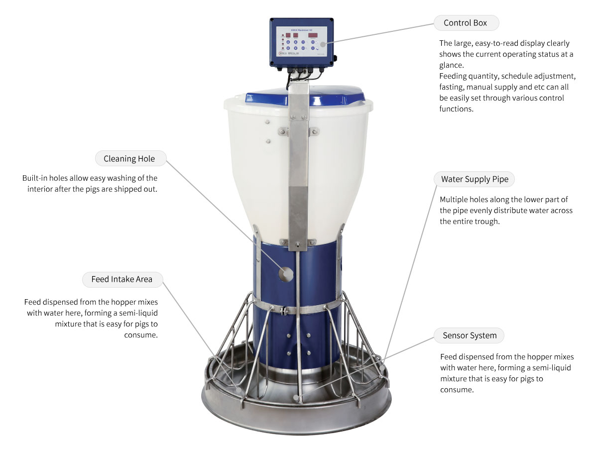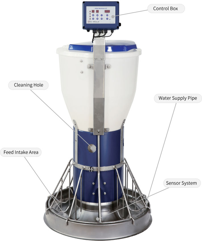 - Easy and simple to operate — once the feed and water supply levels are set on the control box panel, feeding starts immediately.